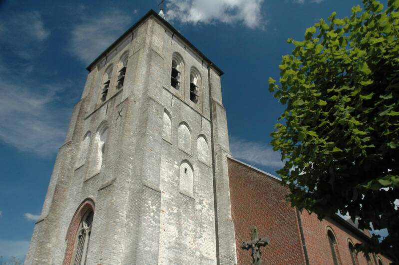 Bij de kerk bemerken we het H. Hartbeeld van Geert Breemersch, in 1928 opgericht ter gelegenheid van het gouden priesterjubileum van Pastoor Ronse.